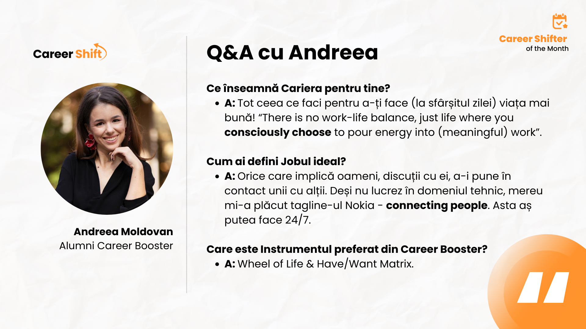 Luna aceasta o avem ca invitată pe Andreea Moldovan - Alumni Career Booster.